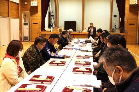 冒頭、各事業の実行委員長からねぎらいと感謝のあいさつがありました。続いて事務局から「添川温泉ふるさと祭り」は、実行委員のアンケート集計結果、「添川小・地区合同大運動会」の競技内容の評価、「イーデ・トーヴ文化祭」への展示作品および来館者の状況等を報告し、課題を次年度の企画へ反映することとしました。
